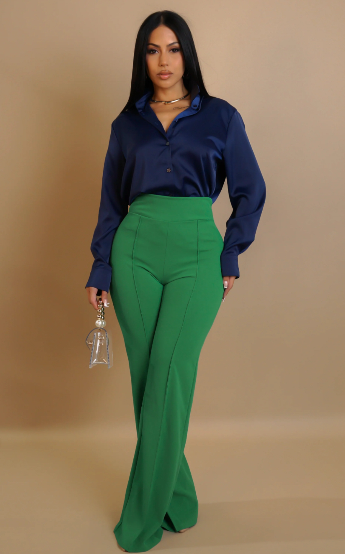 These green pants feature a high-waisted design with a fitted waist that enhances your silhouette. The wide-leg cut offers a modern, relaxed fit, while the stretchy fabric ensures all-day comfort and ease of movement. Ideal for both casual and professional settings, these pants combine style and functionality seamlessly.
